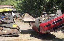 Ketahuan mesum di dalam mobil, seorang ayah hancurkan mobil milik anaknya dengan traktor