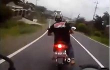 Aksinya ini sangat berbahaya. Pengendara motor ini bergaya ala Valentino Rossi di beberapa tikungan yang dilewatinya.