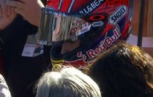 Saat melakukan gerakan di dalam paddock tim Repsol Honda, Marc Marquez masih menggunakan baju dan kardigan Repsol Honda