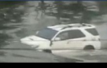 Dalam video berdurasi sekitar 46 detik itu, terlihat SUV berwarna putih itu tetap jalan meski melewati banjir yang ketinggiannya mencapai lantai mobil