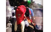 Parahnya, diantara penumpang motor tersebut tampak bayi yang digantung dibagian paling ujung belakang.
