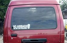 Sebuah stiker di bagian belakang mobil menarik perhatian. Maklum isinya berisi pemakluman kalau nyetir mobil tanpa airbag, matinya kayak laki-laki