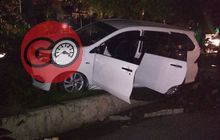 Sempat menghantam pembatas jalan dan terbang masuk ke taman pinggir jalan, mobil tersebut akhirnya berhenti setelah menabrak pohon.