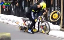 Selalu ada-ada saja kejadian unik yang terjadi pada pagelaran drag bike. Contohnya saja nasib apes yang dialami joki motor drag satu ini.