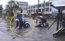 Apes! Lubang Tak Terlihat Karena Banjir, Pengendara Ini Malah Nyungsep