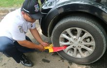 Petugas melakukan penggembokan roda kendaraan roda empat yang kedapatan parkir melanggar rambu larangan.