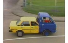 Mobil itu wujudnya, kepala kabinnya pikap, eh bagian belakangnya malah mobil sedan yang kepangkas bagian depannya.