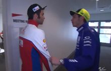 Valentino Rossi terlihat buang muka dari Marc Marquez saat pertemuan antara pembalap dan komisi keselamatan di MotoGP Amerika.
