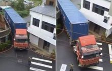Pilih maju atau mundur? Video yang memperlihatkan bagaimana cara truk kontainer ini lolos dari jalan sempit di antara dua rumah.