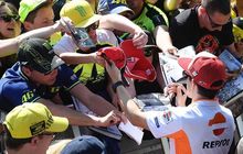 Lucu nih kalau fans Valentino Rossi tiba-tiba berebut minta tangan sama Marc Marquez. Apa yang terjadi? Idola yang tertukar?