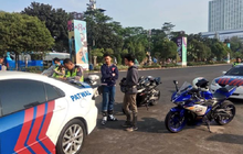 Pihak petugas TMC Polda Metro Jaya melakukan penindakan terhadap pengguna jalan di kawasan Senayan, Jakarta, Minggu (27/5).