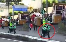 Terlihat seorang polisi dengan santainya menenteng banyak helm ojek online (ojol) yang berwarna hijau. Kayak abis belanja nenteng sayuran!
