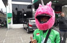 Dari ratusan driver Go-Jek yang memadati jalanan, ada sebuah pemandangan yang terlihat janggal. Helm yang dipakai driver Go-Jek ini menarik perhatian!