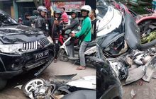 Diduga hendak mendahului dan mengambil jalur berlawanan arah, Mitsubishi Pajero Sport menabrak Honda Scoopy dan Yamaha Jupiter MX di Medan.