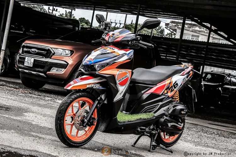 Karakter Honda RC213V begitu terlihat dari Honda Click 125i atau nama kerennya Honda Vario 125. Livery Honda Repsol MotoGP memang jadi tema modifnya.