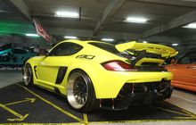 Porsche Cayman ini ruang fendernya lebih diperlebar dengan wide body agar bisa menampung pelek Center Lock ekstra lebar