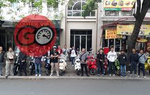 Sekitar 20 Vespa melaju dari Scooter VIP, Bekasi, menuju Tokopedia Tower, Jakarta Selatan, dalam acara bertajuk Fun Ride & Coaching Clinic.