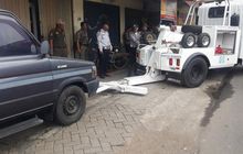 Sebuah mobil terparkir sembarangan ditertibkan Petugas Dinas Perhubungan. Toyota Kijang ini terparkir lama di depan sebuah ruko Pasar Minggu