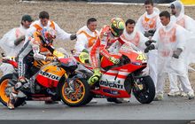Saat terjatuh, motor Valentino Rossi yang berada di sisi dalam menyenggol motor Casey Stoner di sebelah kirinya hingga terjatuh juga.