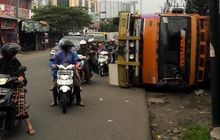 Terjadi insiden kecelakaan truk tronton yang terguling setelah menabrak sebuah warteg dan bengkel las di Jalan Raya Jakarta-Bogor.