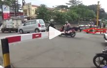 Penumpang Honda BeAT tersangkut palang pintu kereta api hinga terjatuh karena ingin segera lolos dari kemacetan.
