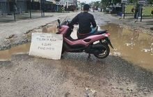 Aksi protes dilakukan oleh pengendara motor Yamaha Nmax berwarna pink di depan jalan rusak yang tergenang air.
