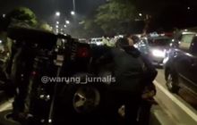 Sebuh mobil Jeep Rubicon terlihat terbalik di sebuah jalan lantaran dibuat tak berdaya oleh pengendara Yamaha NMAX yang mengambil HP milik pengemudi