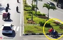 Seorang perempuan membanting motor miliknya setelah motor yang ditumpanginya mendadak mati dan tidak kunjung nyala