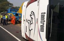 Bus Tentrem N 7859 UG jurusan Malang-Surabaya terguling di Tol Waru KM 748.299, Sidoarjo, Jawa Timur pada Jumat (28/7/2019) pagi.