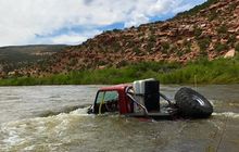 Seorang pria harus rela mobil 4x4 kesayangannya harus terbawa arus ketika menyebrangi sebuah sungai Dolores, Colorado, Amerika ketika trabas.
