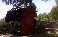 Truk pengangkut puluhan kardus berisi botol jamu terguling di Sumedang, Jawa Barat, Rabu (31/7/2019)