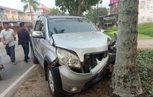Toyota Rush silver mengalami rusak bagian muka setelah menabrak pohon palem di pinggir jalan. Penyebabnya Rush menghindari pengendara Honda Vario