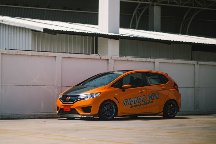 Modifikasi Honda Jazz GK5 yang terlihat mencolok pakai kelir oranye dan pasang turbo jadi tembus 344 dk