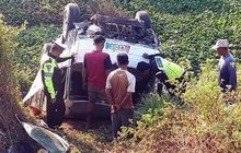 Minibus Isuzu Elf terperosok ke parit dalam keadaan terbalik setelah mengalami pecah ban di Tol Jombang-Mojokerto. Begini kronologinya.