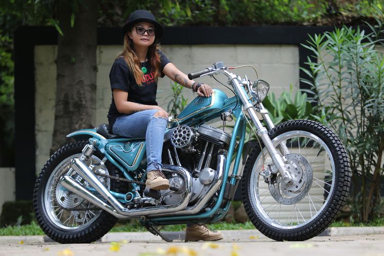 Wanita berambut pirang dengan nama lengkap Iswati Dwi Wulandari atau Awie dari Budung Cycle ialah pemilik H-D Sportster 883 XL
