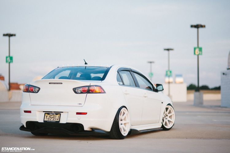 Modifikasi Mitsubishi Lancer Ralliart yang diubah jadi tampil lebih clean look dengan warna serba putih dan kaki-kaki ceper