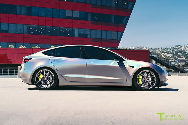Modifikasi mobil listrik Tesla Model 3 hasil garapan T-Sportline dengan tampilan mencolok berkelir hologram dan pelek 20 inci, simak ubahannya