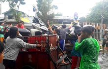 Warga sekitar yang berada di lokasi tersebut mencoba untuk membantu para pemotor untuk dapat melewati banjir tersebut menggunakan gerobak.