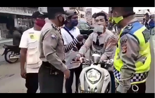 Pengendara Yamaha Fino melawan saat diingatkan petugas untuk menggunakan masker dengan baik, di pos check point perbatasan Kabupaten Bogor.