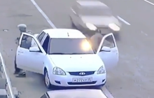 Seorang pria nyaris terserempet kendaraan yang melintas sesaat setelah keluar dari mobil yang diparkirnya