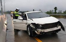 Honda Civic putih tabrak pembatas jalan di Tol Surabaya-Malang hingga ompong. Jalan licin disinyalir jadi penyebab