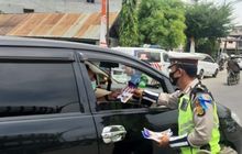 Personel Satlantas Polres Seulawah membagi-bagikan masker, brosur dan stiker akb serta kupon berhadiah, Senin (03/08/2020). Begini penjelasan polisi.