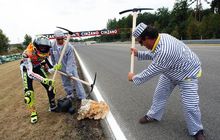 Yup, 17 tahun lalu Valentino Rossi yang masih membalap di tim Repsol Honda macul pakai sekop di Sirkuit Brno. Masih ingat ceritanya?