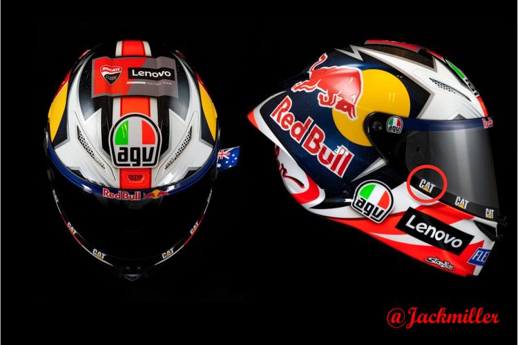 Jack Miller Pamer Grafis AGV Pista GP RR MotoGP 2021, Kok Ada Logo Produsen Alat Berat?