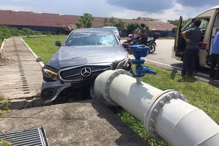Pengemudi kurang hati-hari saat test drive, Mercedes-Benz E-Class AMG 43 berakhir hantam pipa besi. Mukanya sampai bonyok parah!