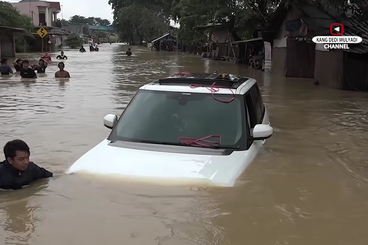 Range Rover Evoque anggota DPR RI, Dedi Mulyadi menyeruak banjir guna salurkan bantuan berupa nasi box ke warga terdampak banjir