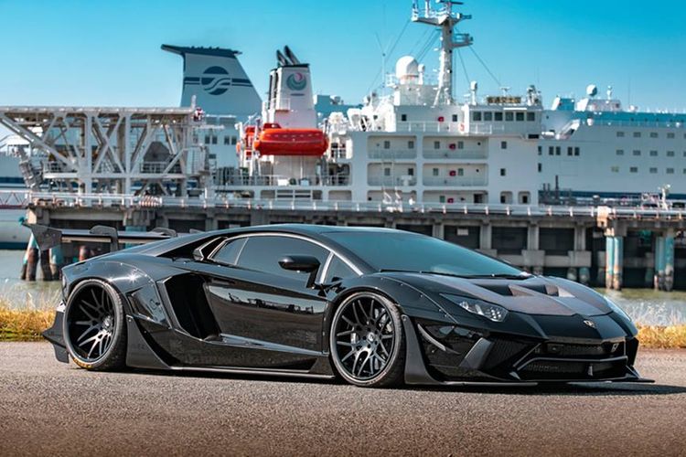 Modifikasi Lamborghini Aventador ini besutan Liberty Walk terlihat begitu misterius dan sangar berwarna hitam plus berbodi gambot