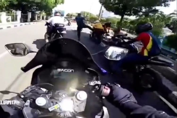 Seorang pengendara Honda CBR250RR ditendang hingga tersungkur karena dianggap berupaya menembus pengamanan ring 1