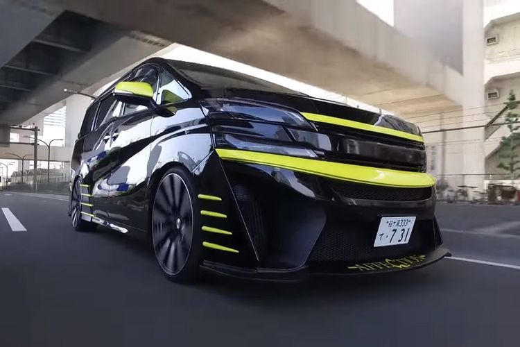 Modifikasi Toyota Vellfire berkelir hitam ini tampil mencolok berkat aksen kuning yang disematkan pada bodi. Simak ulasannya