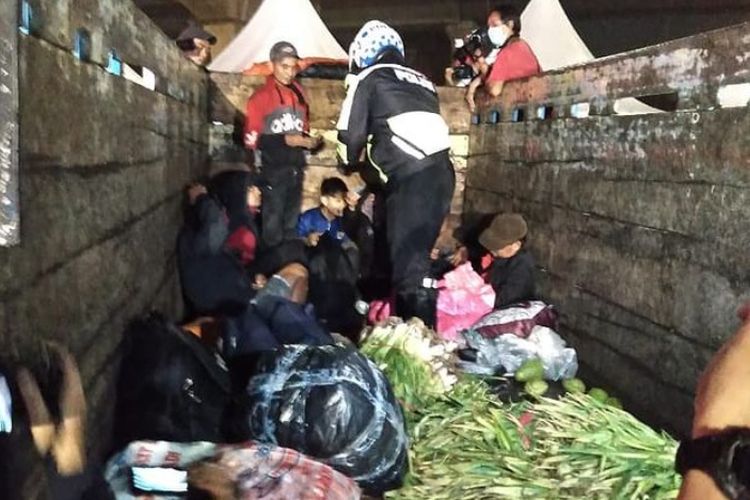 Hari pertama Polisi berhasil menemukan sejumlah pemudik yang bersembunyi di dalam truk sayur untuk pulang ke kampung halamannya.
